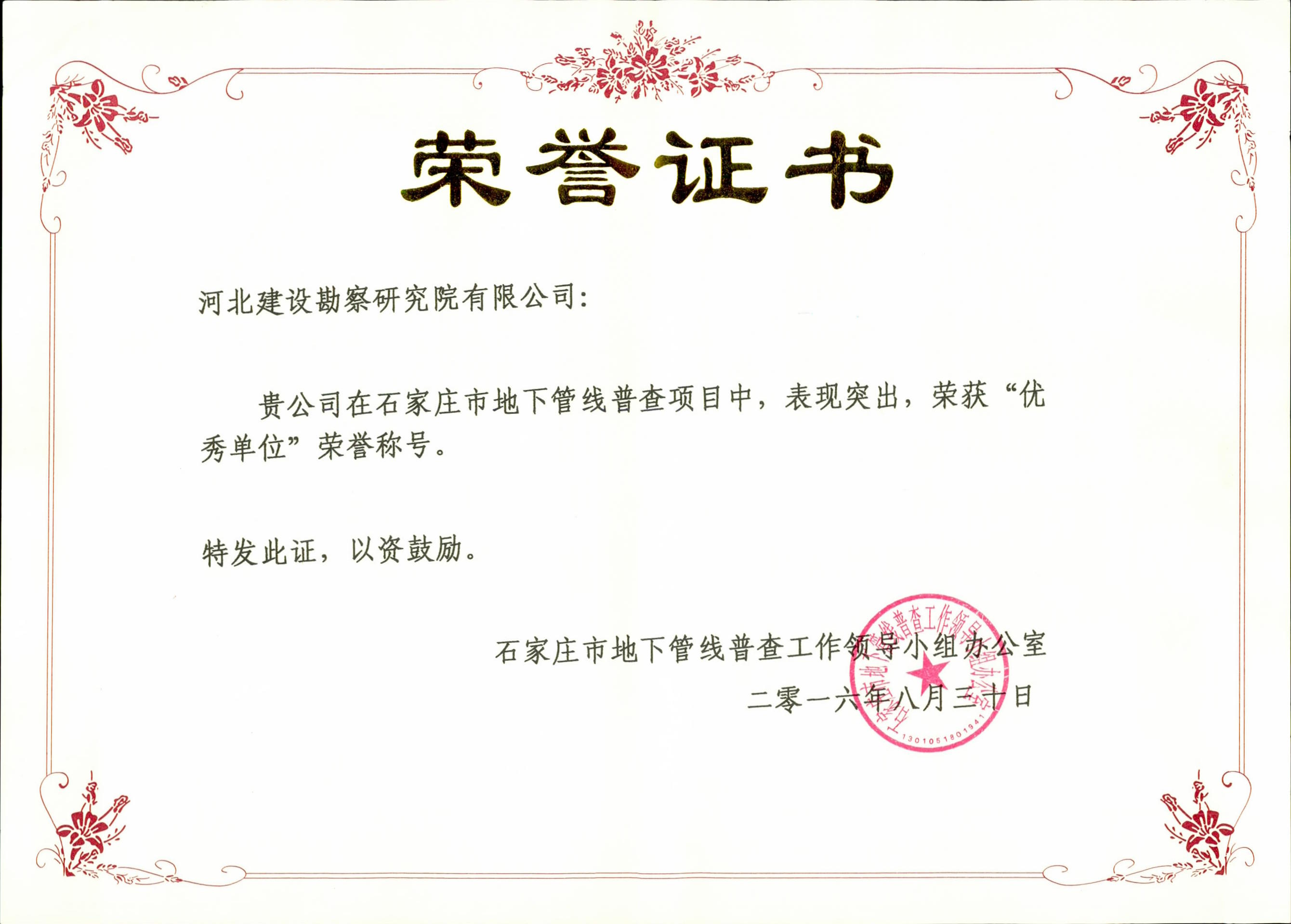 公司承擔(dān)的石家莊市地下管線普查項目于近日完工,并順利通過石家莊市地下管線普查工作領(lǐng)導(dǎo)小組檢查。石家莊市地下管線普查工作領(lǐng)導(dǎo)小組充分肯定了我公司在該項目中取得的成績和突出的表現(xiàn),特頒發(fā)“優(yōu)秀單位”榮譽(yù)證書,以資鼓勵。