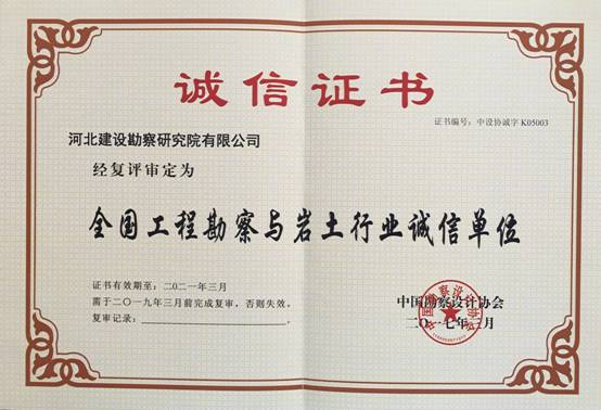 根據(jù)中國勘察設(shè)計(jì)協(xié)會(huì)5月15日發(fā)布的中設(shè)協(xié)字[2017]29號(hào)文件《關(guān)于公布工程勘察與巖土行業(yè)第一批第二批“誠信單位”復(fù)評(píng)、復(fù)審結(jié)果的通知》,我公司作為第一批271家“誠信單位”之一,通過復(fù)評(píng)審核,被審定為全國工程勘察與巖土行業(yè)誠信單位,并于近日領(lǐng)取了誠信證書。