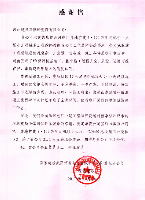我公司承建的焦作丹河電廠異地擴建2×100萬千瓦機組上大壓小工程樁基工程,始終按照業主工作總體部署要求,努力克服施工現場地質情況復雜、工期緊、任務重、施工條件差等不利因素,超前完成了#0標段樁基施工,整個施工過程安全、質量、進度可控在控,贏得了建設管理方的高度認可。11月28日,國家電投集團河南電力有限公司沁陽發電分公司工程管理部發來感謝信,對我公司項目部員工表示感謝,并期待與我公司的再度合作。
