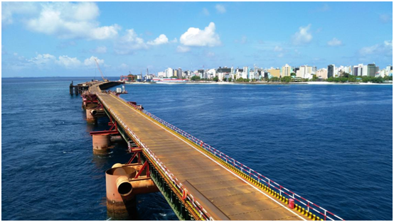 中馬友誼大橋位于馬爾代夫北馬累環(huán)礁(North Malé Atoll),跨越Gaadhoo Koa海峽,連接環(huán)礁上馬累島、機場島(瑚湖爾島)兩個相鄰島嶼,是馬爾代夫重要的島嶼連接線工程。項目起點位于馬累島東南角,順接規(guī)劃Boduthakurufaanu Magu道路,隨后設(shè)置橋梁跨越Gaadhoo Koa 海峽,在機場島南段登陸,大橋接線與機場到Hulhumale 規(guī)劃路順接,全橋長度2km,雙向四車道,由橋梁、引堤、道路等工程組成,主橋為主跨180m混合疊合梁連續(xù)鋼構(gòu)橋,引橋為蓋梁混凝土預制梁橋。項目采用中國公路工程規(guī)范標準,設(shè)計使用壽命100年。