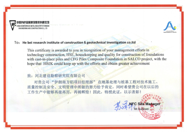 我公司承建的伊朗南方鋁項目,自開工以來精心策劃、有效組織、認真施工、積極與業主配合,保質保量完成了施工進度。在施工過程中業主對我公司伊朗南方鋁項目部在技術施工、質量控制及安全、文明管理中所做的努力給予了肯定,并授予表彰證書。