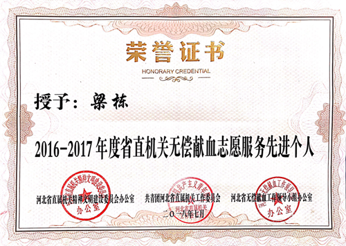 梁棟同志被授予2016-2017年度省直機關(guān)無償獻血志愿服務(wù)先進個人