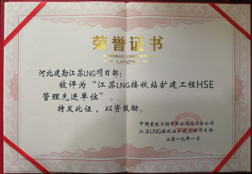 由于我公司的出色表現,總包方中國寰球工程有限公司北京分公司對我公司和個人進行了表彰,授予我公司“質量管理先進單位”和“HSE管理先進單位”,并對周進發、朱凱云、李友峰授予了“優秀項目管理者”稱號,對賈沖、冀紫豪、任書星、李昭、張勇、張旺授予了“質量管理先進個人”稱號,對劉志峰、辛朝友、邢鐸、付嘉嘉、宋江來授予了“HSE管理先進個人”稱號,分別頒發了錦旗、榮譽證書、獎牌。