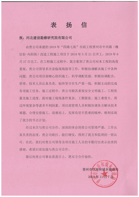 我公司承建的2019年“四路七街”市政工程晉州市中興路(魏征街-向陽街)改造工程,在施工過程中,項(xiàng)目部精心組織策劃,科學(xué)調(diào)配資源,主動(dòng)認(rèn)真負(fù)責(zé),始終堅(jiān)守在生產(chǎn)第一線,確保了工期、質(zhì)量、安全,順利實(shí)現(xiàn)了業(yè)主的節(jié)點(diǎn)計(jì)劃,得到了業(yè)主和監(jiān)理的一致認(rèn)可,為晉州的后續(xù)市場開拓出了新局面。
