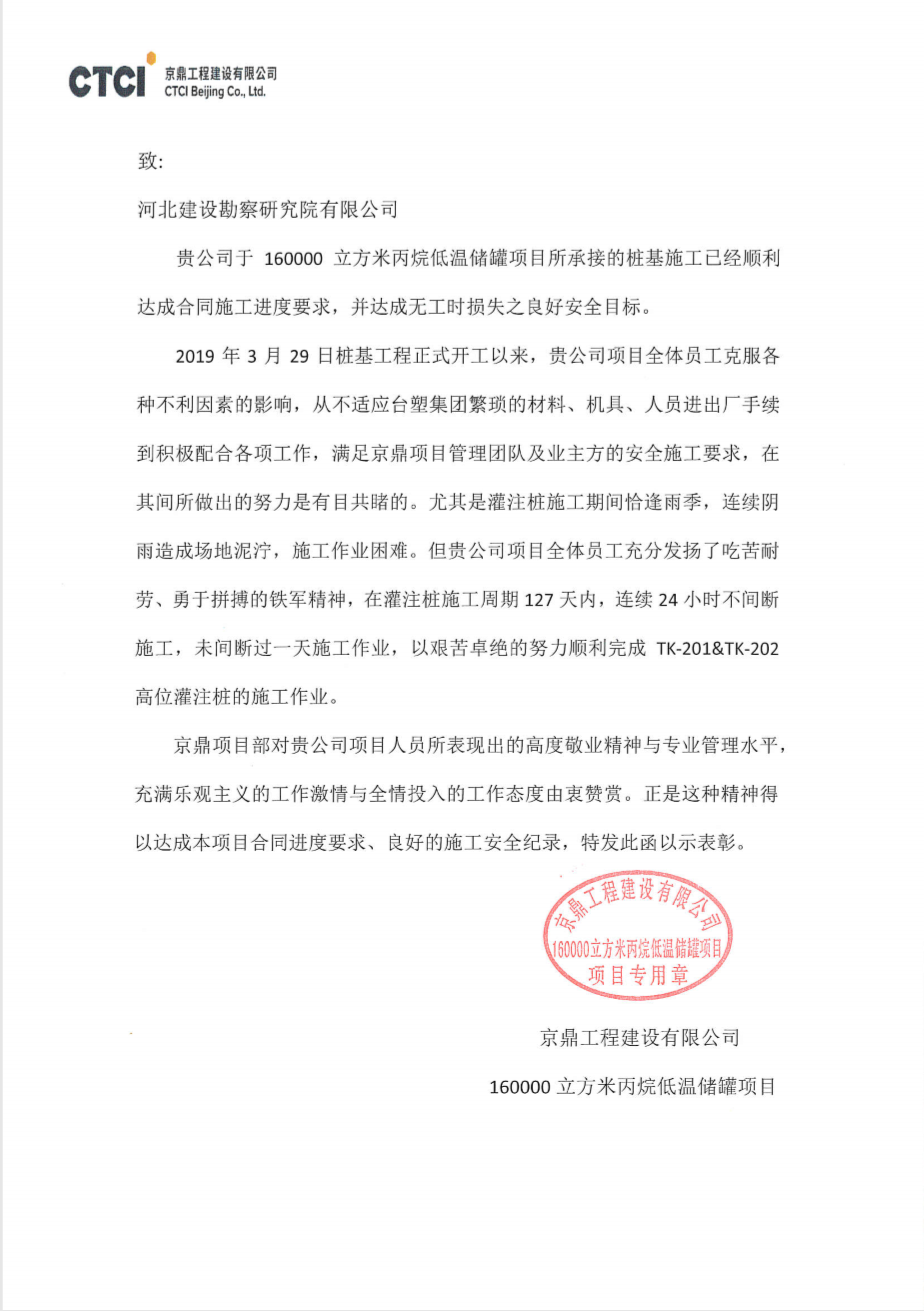 我公司承接的160000立方米丙烷低溫儲罐樁基施工工程,自開工以來,項目部全體員工克服各種不利因素的影響,經過艱苦卓絕的不懈努力,已順利達成合同施工進度要求,并達成無工時損失之良好安全目標,滿足京鼎項目團隊及業主方的安全施工要求,已圓滿完成各項施工任務,順利完工。期間所表現出的高度敬業精神和專業管理水平,得到了業主和監理的一致好評,近期特向我公司發函予以表揚。
