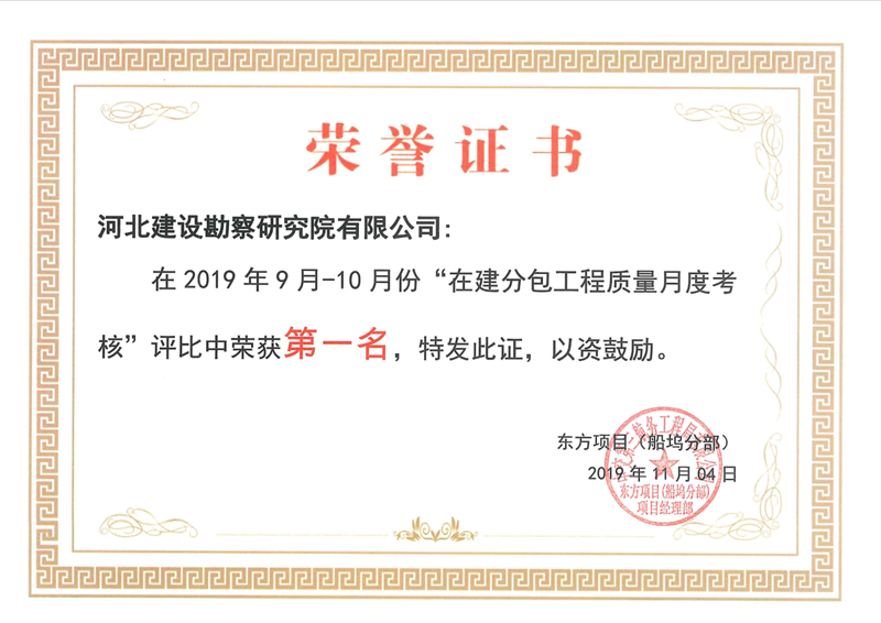 我公司俄羅斯東方船廠項目部,在2019年9月-10月份整個東方船廠項目十幾家施工單位質(zhì)量月度考核評比中,榮獲第一名的好成績。