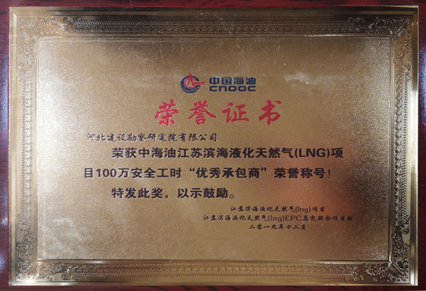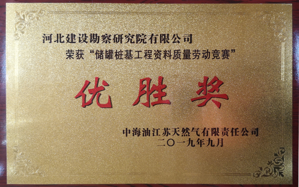 由我公司承建的江蘇液化天然氣(LNG)接收站1#、2#儲罐樁基工程已于2019年09月01日施工完成,2019年12月01日全部檢測完成,樁基檢測結果全為Ⅰ類樁。在施工期間的質(zhì)量安全管理及我公司項目部的工作作風和工作態(tài)度受到了總包、監(jiān)理及業(yè)主單位的充分肯定。在江蘇液化天然氣(LNG)接收站工程項目完工之際,為我公司頒發(fā)了“優(yōu)秀承包商”證書。在建設單位組織的“儲罐樁基工程資料質(zhì)量勞動競賽”中,通過項目部的努力及公司的全力幫助,獲得優(yōu)勝獎。