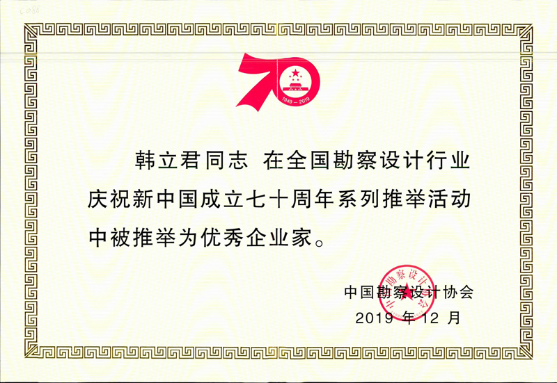 為慶祝中華人民共和國成立70周年,展示新中國成立70年來全國勘察設計行業為國家經濟和社會發展作出的巨大貢獻以及行業取得的輝煌成就,2019年12月11日,中國勘察設計協會在廣州召開了全國勘察設計同業協會共慶新中國成立70周年大會暨中國勘察設計協會六屆二次會員代表大會。會上,發布了全國勘察設計行業新中國成立70年系列推舉榜單,538個項目、214家企業、185位企業家、168位科技工作者、118位行業人士、52家協會、83位協會工作者分別榮獲了系列推舉活動的各項榮譽稱號。