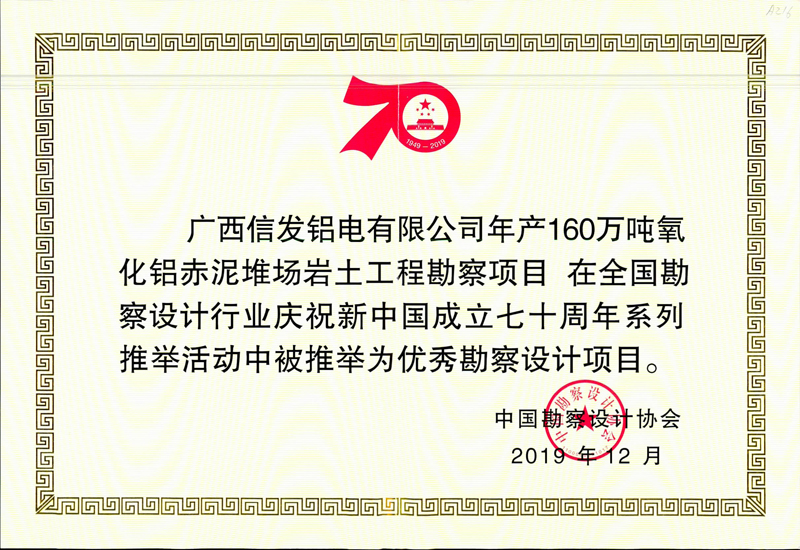 其中,我公司榮獲“優秀勘察設計企業”榮譽稱號,董事長韓立君榮獲“優秀企業家”稱號,總工程師聶慶科榮獲“科技創新帶頭人”榮譽稱號。我公司完成的張家口腰站堡水源地(15萬噸/日)供水水文地質勘察項目、廣西信發鋁電有限公司年產160萬噸氧化鋁赤泥堆場巖土工程勘察項目被推舉為優秀勘察設計項目。