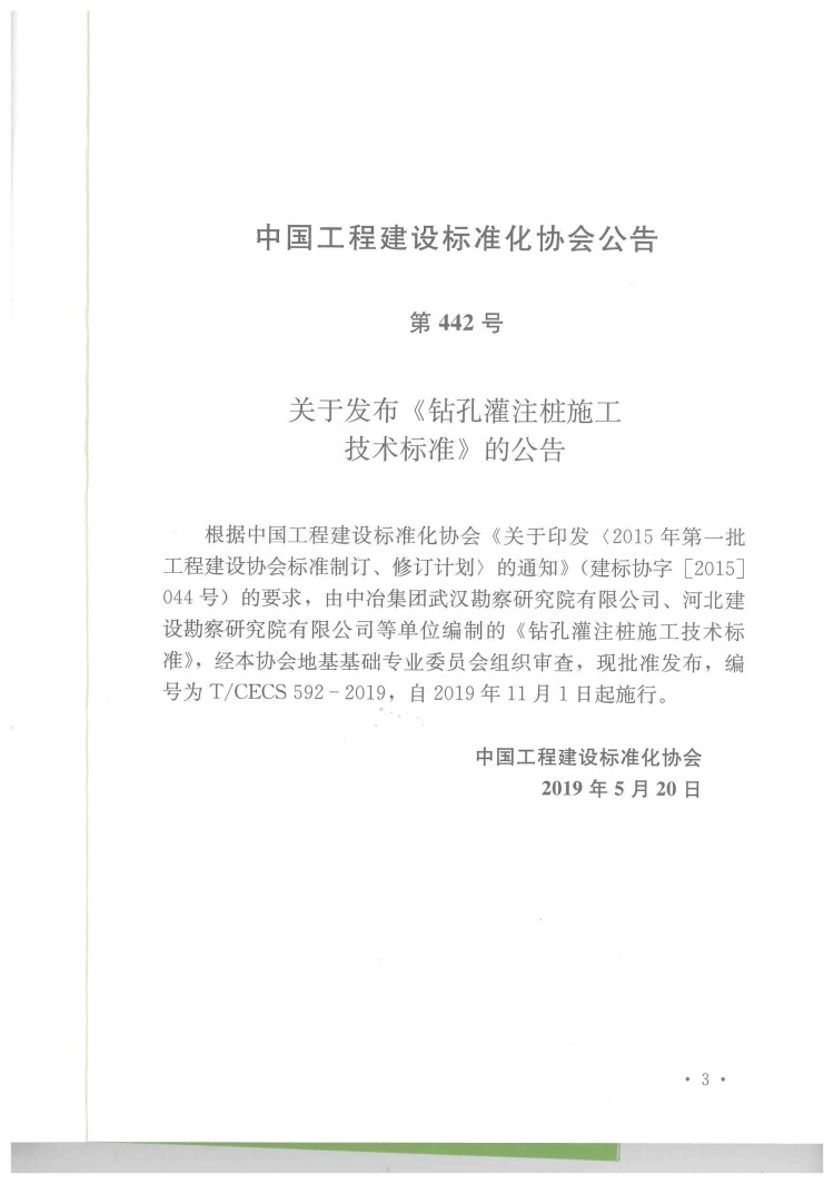 近日,我公司主編的中國工程建設標準化協會標準《鉆孔灌注樁施工技術標準》(T/CECS 592-2019)由中國建筑工業出版社正式出版發行,于2019年11月1日起實施。