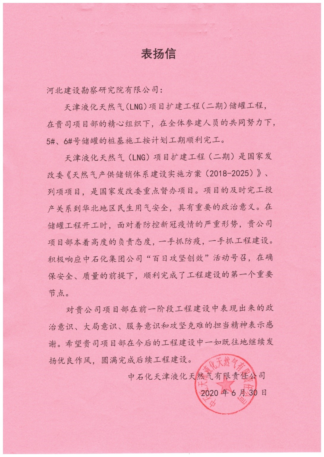 公司承建的天津液化天然氣(LNG)項(xiàng)目擴(kuò)建工程(二期)5#6#罐樁基工程,自2020年4月5日正式開工,歷經(jīng)83個(gè)日夜的奮戰(zhàn),最終于2020年6月26日優(yōu)質(zhì)、高效、圓滿的完成了5#6#罐的樁基施工任務(wù)。中石化天津液化天然氣有限責(zé)任公司,對(duì)我公司中石化天津LNG二期項(xiàng)目部提出表?yè)P(yáng),表?yè)P(yáng)我公司領(lǐng)導(dǎo)及全體項(xiàng)目施工人員對(duì)項(xiàng)目高度負(fù)責(zé)的態(tài)度,一手抓防疫,一手抓工程建設(shè),積極響應(yīng)中石化集團(tuán)公司“百日攻堅(jiān)創(chuàng)效”活動(dòng)號(hào)召,在確保安全、質(zhì)量的前提下,順利完成了工程建設(shè)的第一個(gè)重要節(jié)點(diǎn)。同時(shí)對(duì)我公司在前一階段工程建設(shè)中表現(xiàn)出來的政治意識(shí)、大局意識(shí)、服務(wù)意識(shí)和攻堅(jiān)克難的擔(dān)當(dāng)精神表示感謝。希望我公司在今后的工程建設(shè)中一如既往地繼續(xù)發(fā)揚(yáng)優(yōu)良作風(fēng),圓滿完成后續(xù)工程建設(shè)。