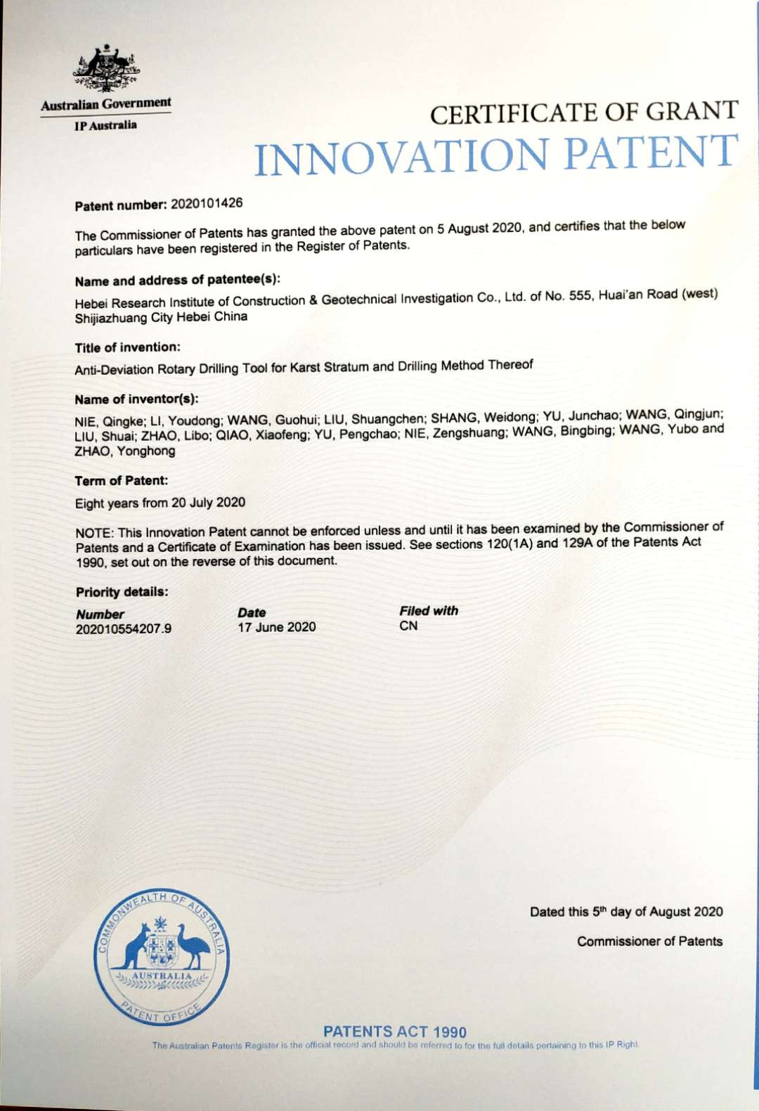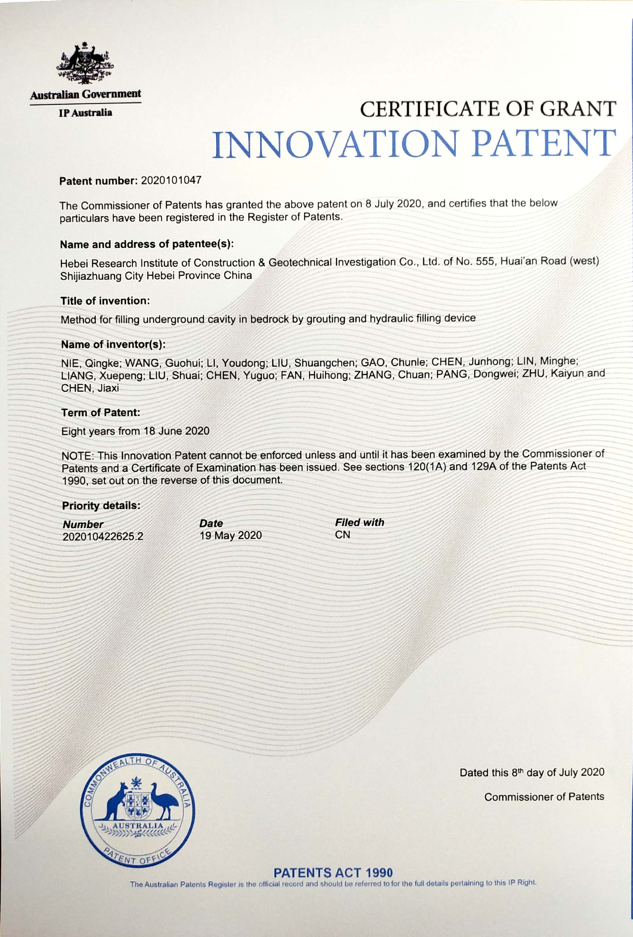 近日,由我公司開發(fā)完成的兩項(xiàng)新技術(shù):“一種填料注漿充填基巖地下空洞的方法以及一種水力充填裝置”、“一種巖溶底層旋挖鉆孔防斜鉆具及鉆孔方法”,被授予澳大利亞專利權(quán)。這是公司第一次申請(qǐng)國(guó)際專利,申請(qǐng)成功提升了公司無(wú)形資產(chǎn)價(jià)值與品牌價(jià)值,體現(xiàn)了我公司較強(qiáng)的技術(shù)創(chuàng)新能力及企業(yè)綜合實(shí)力。