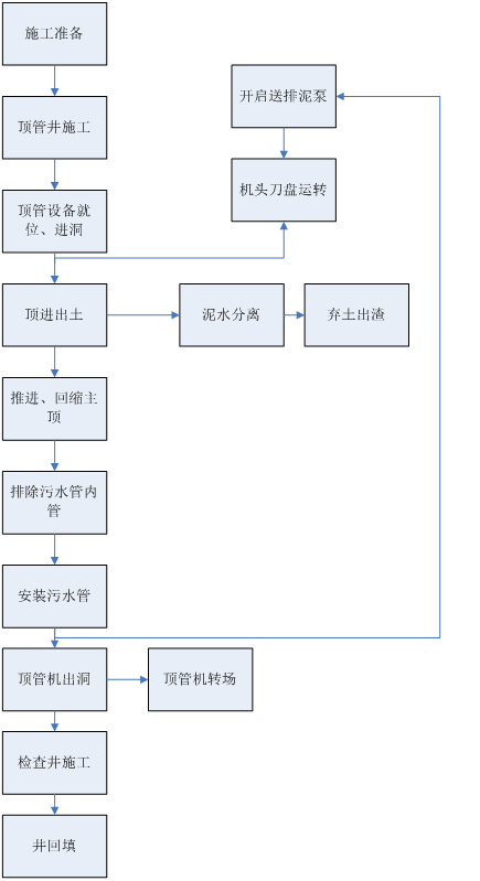 作為本次工程項目運用泥水平衡頂管機的施工技術工藝流程圖,前期準備、工作井、接收井施工、設備就位、安裝止水膠圈、進洞、頂進出土、分離泥水、回縮主頂、安裝頂管、頂管機出洞轉場,進行檢查井施工后回填。