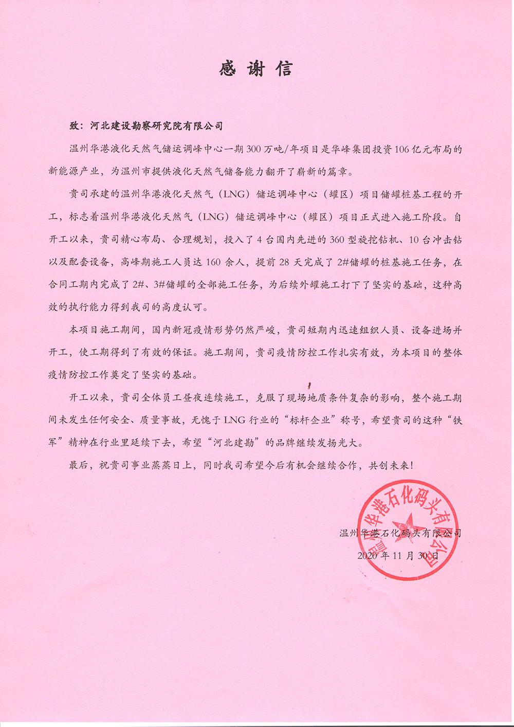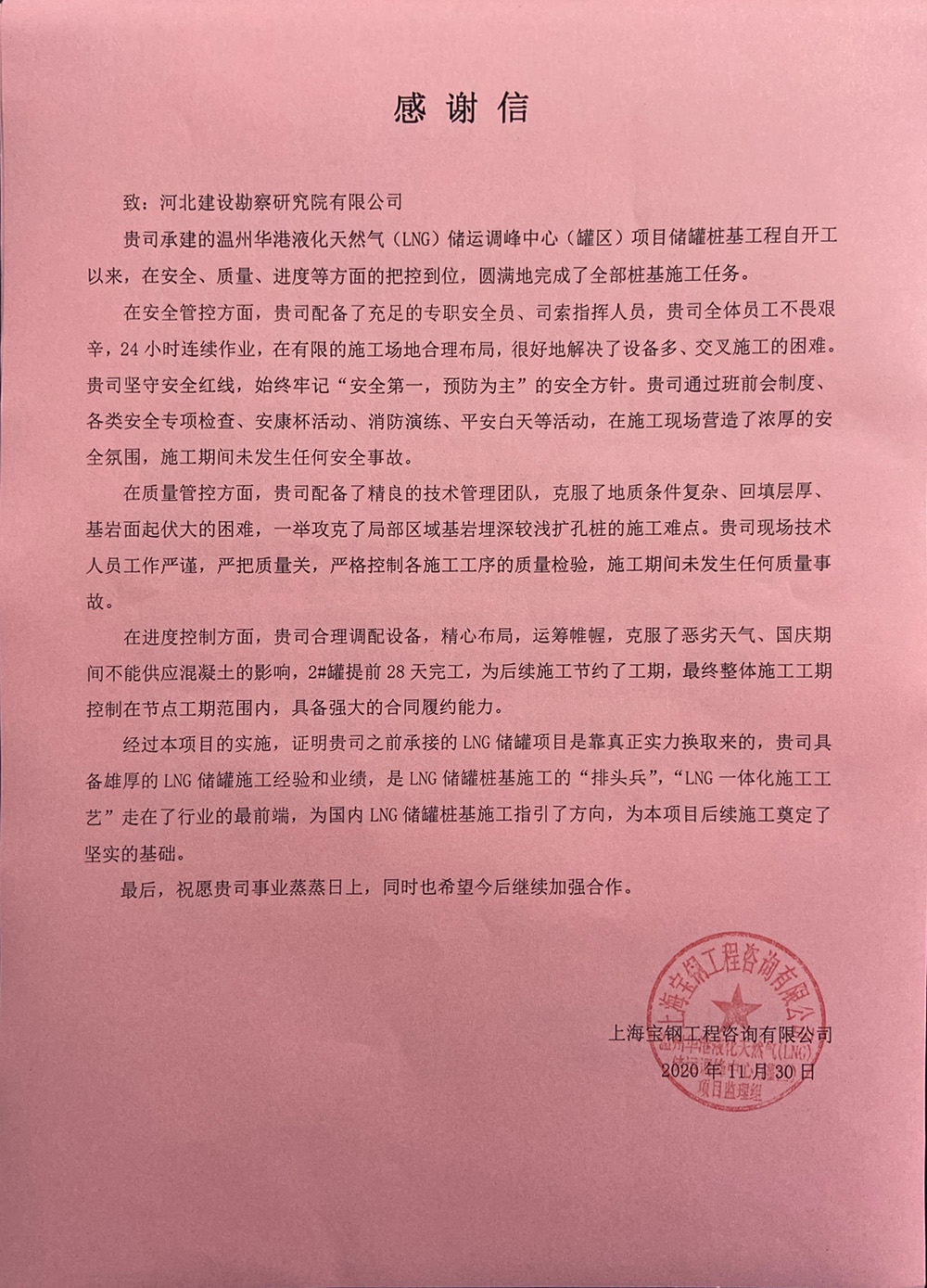 溫州華港LNG項(xiàng)目自2020年8月19日開工以來,面對(duì)地質(zhì)情況復(fù)雜、工期緊、任務(wù)重、施工條件差等諸多不利因素,項(xiàng)目部精心部署工作,科學(xué)組織生產(chǎn),全體員工大力發(fā)揚(yáng)“不怕累、不怕苦、全力打造精品工程”的精神,在嚴(yán)格落實(shí)疫情防控措施的同時(shí),嚴(yán)把進(jìn)度關(guān)、質(zhì)量關(guān)、安全關(guān),確保制定的施工計(jì)劃有序推進(jìn),最終高標(biāo)準(zhǔn)完成項(xiàng)目施工,兌現(xiàn)了公司的承諾,為溫州華港LNG工程的竣工投產(chǎn)奠定了堅(jiān)實(shí)的基礎(chǔ)。為此,業(yè)主、總包、監(jiān)理紛紛發(fā)來表揚(yáng)信,對(duì)我項(xiàng)目部提出表揚(yáng),并衷心祝愿我公司發(fā)展業(yè)績(jī)蒸蒸日上,再創(chuàng)輝煌。