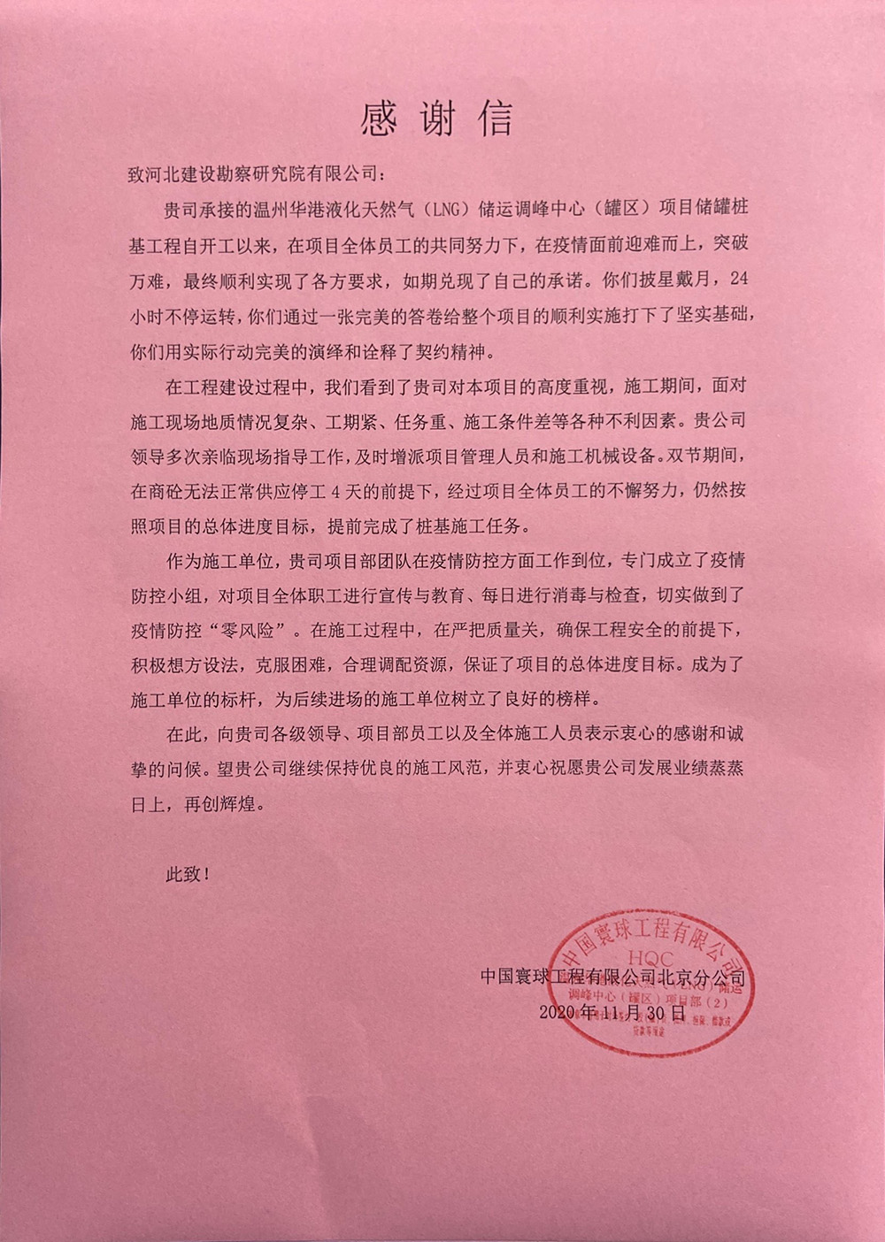 近日我公司溫州華港LNG項(xiàng)目部喜獲業(yè)主、總包、監(jiān)理的表揚(yáng)信,這是對(duì)項(xiàng)目部全體參建人員不畏艱難、頑強(qiáng)拼搏、攻堅(jiān)克難的施工精神的認(rèn)可和贊揚(yáng),更是對(duì)河北建勘高度的肯定。