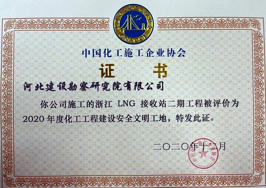 近日,由我公司施工的浙江LNG接收站二期工程被中國化工施工企業協會評為“2020年度化工工程建設安全文明工地”,并獲獎牌和榮譽證書。