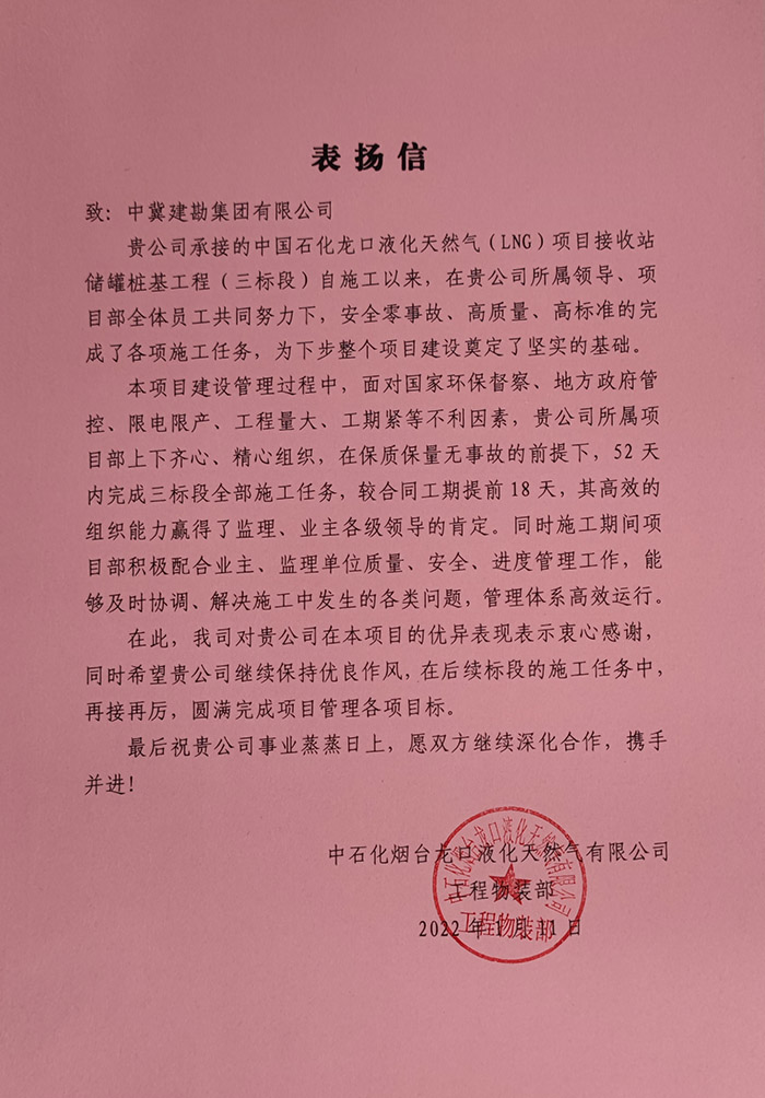 廣東惠州埃克森美孚惠州乙烯一期項目樁基工程,榮獲埃克森美孚(惠州)化工有限公司及中國石化工程建設有限公司惠州項目部“達到1000000安全人工時”優秀團隊獎,耿蕩榮獲“安全先進個人獎”。