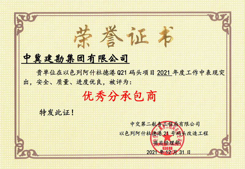 其中,以色列阿什杜德港Q21碼頭項目榮獲“優(yōu)秀分承包商”團隊獎,李五一榮獲“優(yōu)秀項目經理”、賀海亮榮獲“SHE管理先進個人”、宋宇峰榮獲“優(yōu)秀質量管理先進個人”、張軍鋒榮獲“優(yōu)秀管理先進個人”、李良啟、聶彥科榮獲“優(yōu)秀技術操作手”、劉宗正榮獲“優(yōu)秀電工”、張秋東榮獲“優(yōu)秀后勤”、趙杰榮獲“優(yōu)秀操作標兵”榮譽稱號。