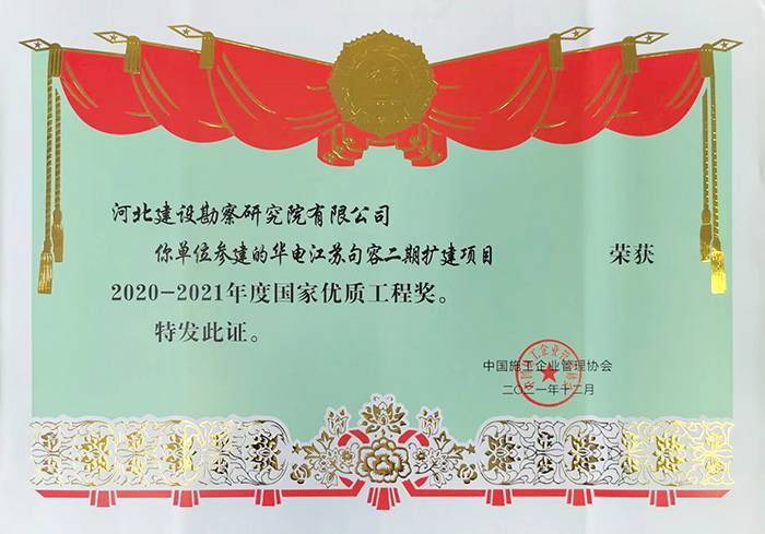 我公司參建的華電江蘇句容二期擴(kuò)建項(xiàng)目榮獲2020—2021年度國(guó)家優(yōu)質(zhì)工程獎(jiǎng)。