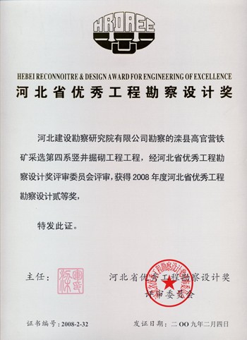 灤縣高官營鐵礦采選第四采豎井掘砌工程獲河北省優(yōu)秀工程勘察設(shè)計二等獎。