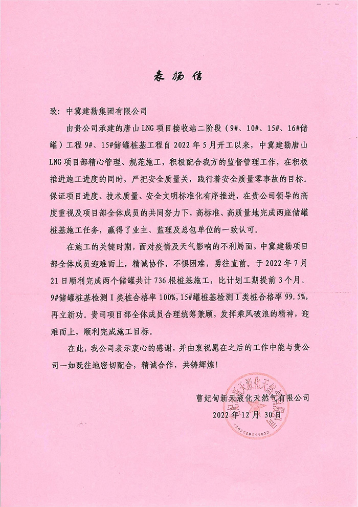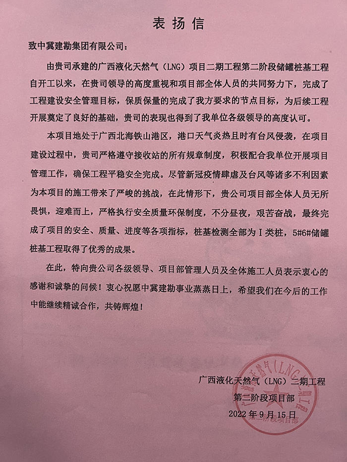 2022年12月30日我公司收到業(yè)主曹妃甸新天液化天然氣有限公司發(fā)來的表揚信。由我公司承建的唐山LNG項目接收站二階段(9#、10#、15#、16#儲罐)工程9#、15#儲罐樁基工程,主要施工內(nèi)容為736根樁徑1.4m、樁長71m/74m混凝土灌注樁,本項目自2022年5月31日開工以來,在唐山LNG項目部精心管理、規(guī)范施工下,嚴把安全質(zhì)量關,踐行著安全質(zhì)量零事故目標,于2022年7月21日順利完成所有施工任務,贏得業(yè)主、監(jiān)理及總包的一致認可。樁基檢測完成后,9#儲罐樁基檢測I類樁率100%,15#儲罐I類樁率99.5%,再創(chuàng)新高。在施工過程中,項目部全體成員面對惡劣天氣的不利影響及新冠疫情肆虐的局面,迎難而上,精誠協(xié)作,砥礪前行,淋漓盡致地詮釋了建勘人的鐵軍精神,為項目順利完成奠定堅實基礎。