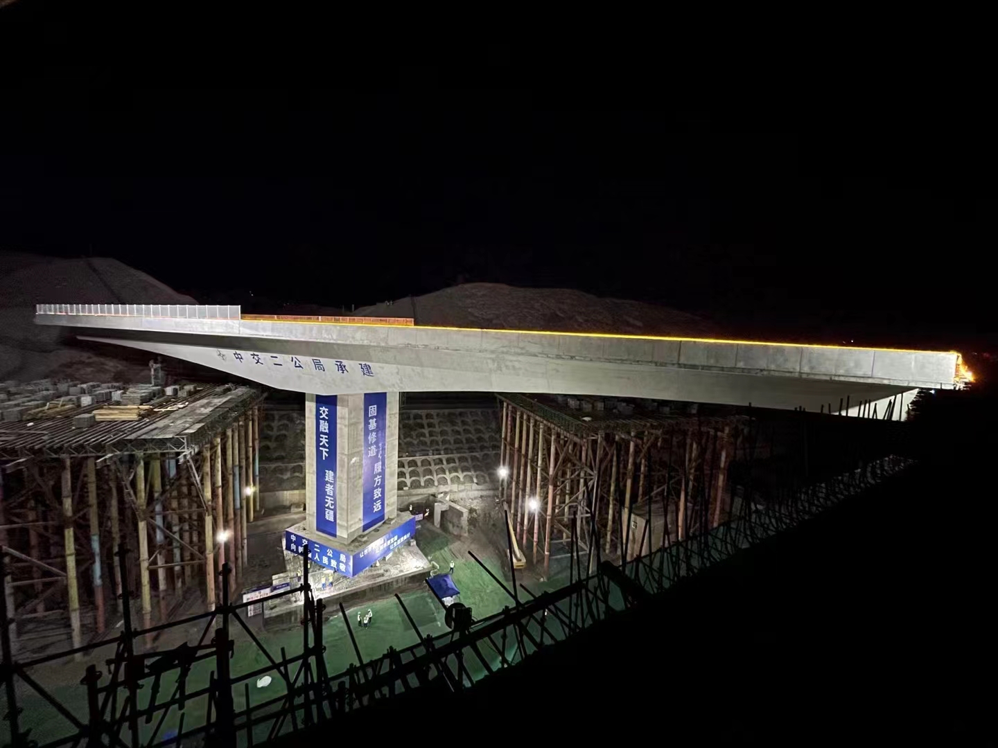 烏魯木齊市東二環項目燕北高架橋,上跨蘭新鐵路,橋面寬度32.5米,跨度70米,雙向八車道城市快速路,是新疆噸位最大、跨徑最大的轉體橋,轉體段總重16500噸。主橋梁采用鋼立柱+貝雷梁+承插型盤扣式鋼管腳手架等組合架體現澆施工,架體高度36米,耗用鋼材4000多噸,現澆完成后形成兩個長55米的T形構架,然后轉體77°合攏,跨度為70米,是項目全線重難點控制性工程,同時也是目前新疆地區最大的市政工程轉體橋梁。