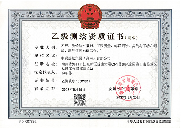 在集團公司領導的正確領導下,經過工程測量公司和安全生產部的精心運作,中冀建勘集團(海南)有限公司于2023年9月20日取得了海南測繪地理信息局頒發的測繪乙級資質,資質包含五個專業:測繪航空攝影、工程測量、海洋測繪、界線與不動產測繪、地理信息系統工程。