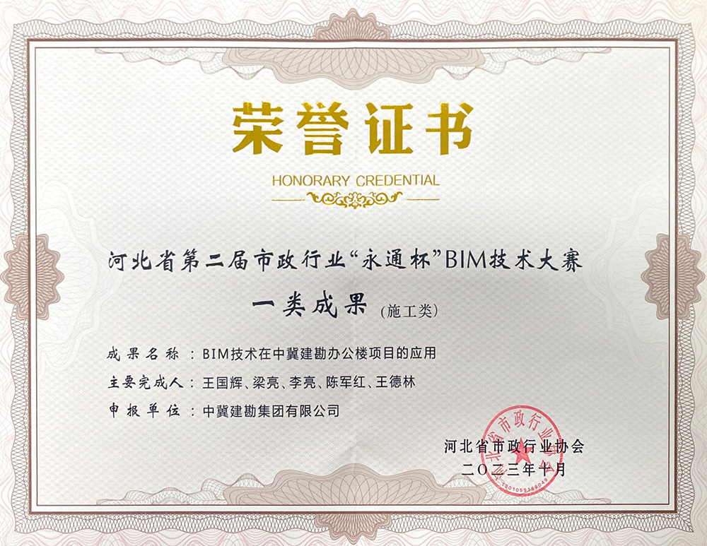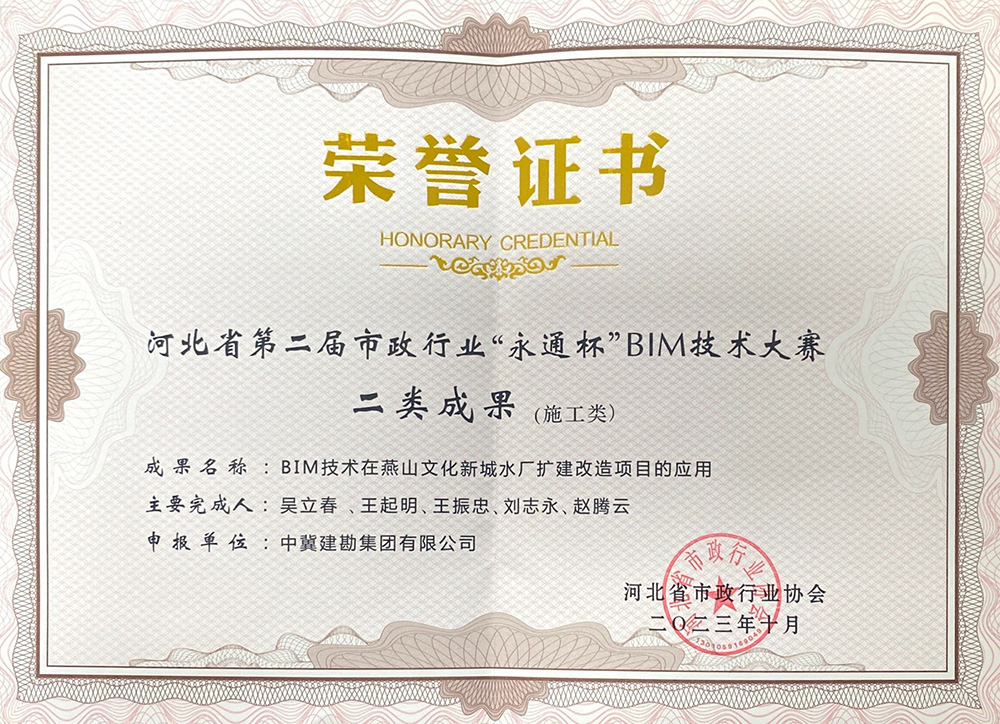 近日,河北省市政行業協會發文《關于公布河北省市政行業第二屆“永通杯”BIM技術應用大賽結果的通知》(冀市協{2023}37號),我公司參賽項目“BIM技術在中冀建勘辦公樓項目的應用”項目榮獲一類成果、“BIM技術在燕山文化新城水廠擴建改造項目的應用”項目榮獲二類成果。