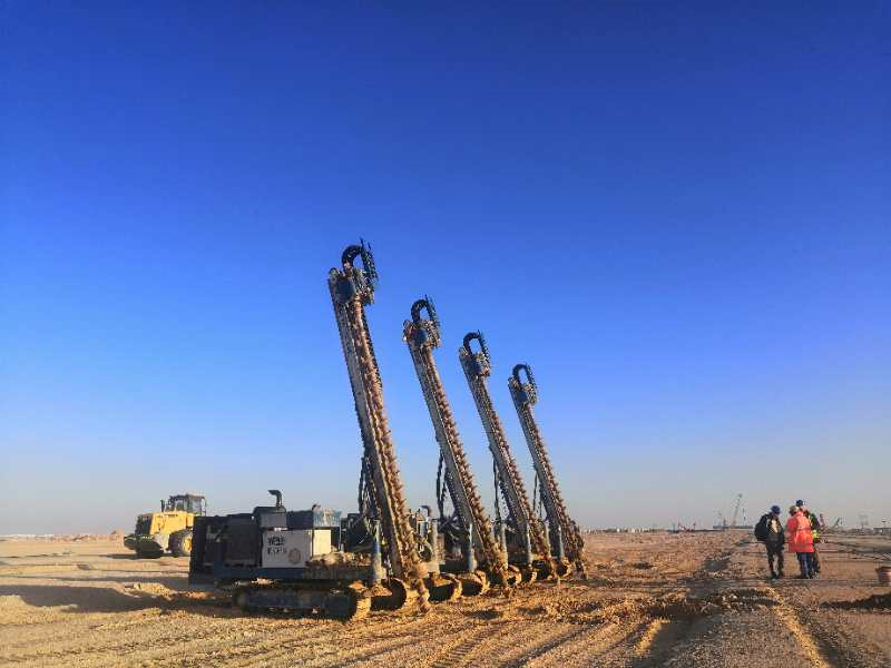 Dhafra PV2太陽(yáng)能電站工程位于阿聯(lián)酋阿布扎比,由Dhafrah PV2 Energy Company LLC投資建設(shè)。工程共計(jì)完成直徑為300mm的H型鋼樁109504根,直徑為400mm的H型鋼樁34909根,混凝土包裹樁身2.05-2.8m。以及直徑為300mm的清掃機(jī)器人的樁1880根,直徑為450mm的機(jī)器人通訊塔的樁36根。