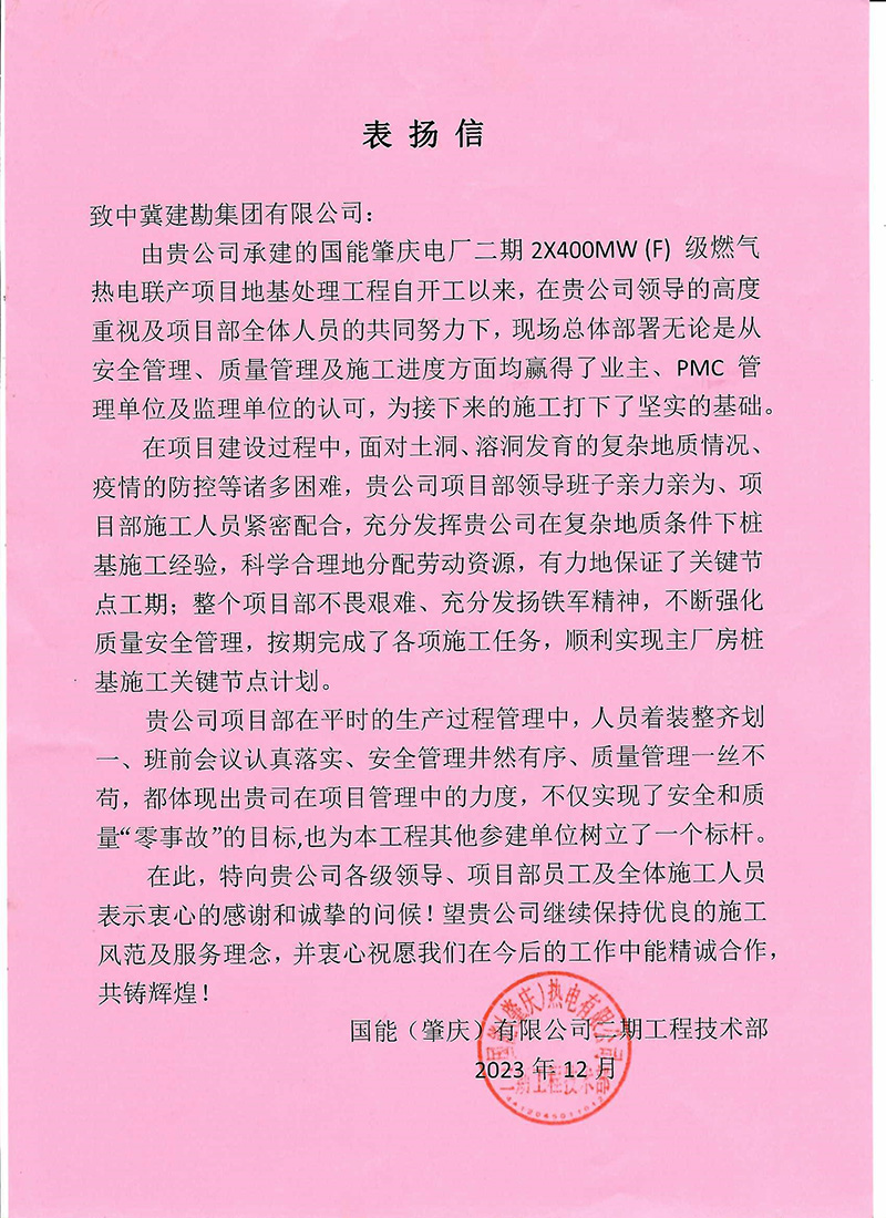 卡麥±400千伏換流站工程樁基施工工程收到業主國家電網有限公司特高壓建設分公司發來的表揚信。項目部敢打硬仗的精神面貌,贏得了業主方的高度贊賞和認可。