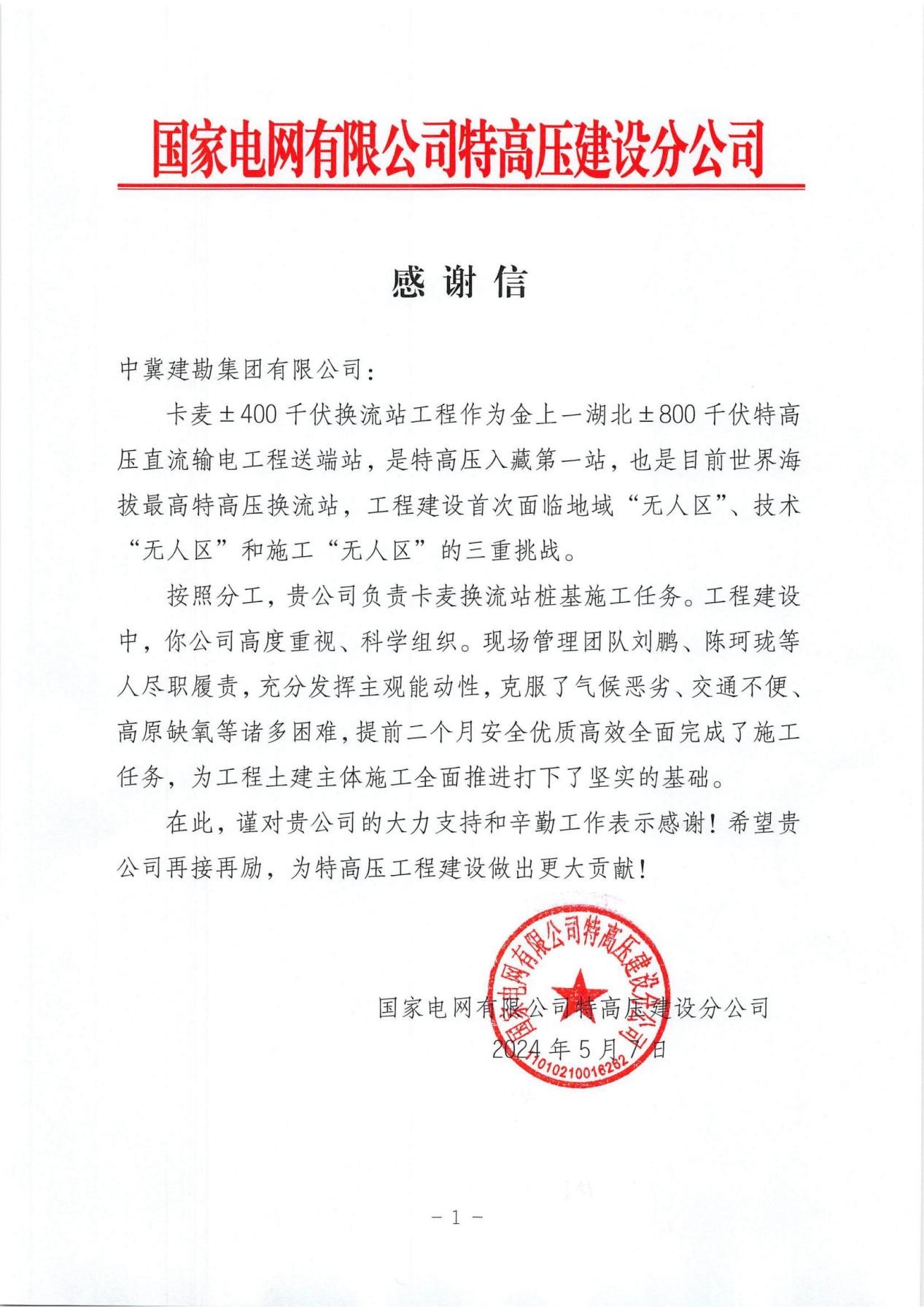 同時(shí),業(yè)主及監(jiān)理給予了極高的贊譽(yù)與肯定,授予了我公司“優(yōu)秀承包商”的榮譽(yù)稱號(hào);授予劉鵬同志“優(yōu)秀項(xiàng)目經(jīng)理”榮譽(yù)稱號(hào);陳珂瓏同志“優(yōu)秀項(xiàng)目總工”榮譽(yù)稱號(hào);紀(jì)曉蒙同志“優(yōu)秀項(xiàng)目副經(jīng)理”榮譽(yù)稱號(hào);李鑫同志“優(yōu)秀安全總監(jiān)”榮譽(yù)稱號(hào);張和平同志“優(yōu)秀項(xiàng)目質(zhì)檢員”榮譽(yù)稱號(hào);魏耀文同志“優(yōu)秀項(xiàng)目技術(shù)員”榮譽(yù)稱號(hào);張博杰同志“優(yōu)秀項(xiàng)目技術(shù)員”榮譽(yù)稱號(hào);王美兵同志“優(yōu)秀項(xiàng)目施工員”榮譽(yù)稱號(hào)。此外,針對(duì)項(xiàng)目部在卡麥換流站做出的突出貢獻(xiàn),國網(wǎng)特高壓分公司特意撰寫了一份感謝信,對(duì)于我公司的施工履約能力給予肯定和感謝,期待后續(xù)工程繼續(xù)合作,再創(chuàng)佳績(jī)!