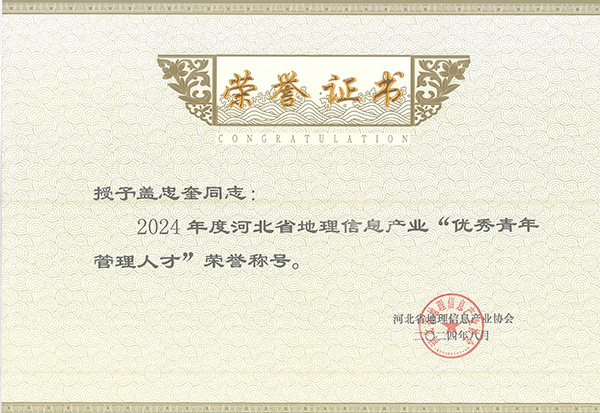 近期,由河北省地理信息產業(yè)協(xié)會評選,我公司被授予第五屆理事會“先進工作單位”榮譽稱號和2022-2023年度河北省地理信息產業(yè)“十佳單位”榮譽稱號,蓋忠奎同志榮獲2024年度河北省地理信息產業(yè)“優(yōu)秀青年管理人才”稱號。