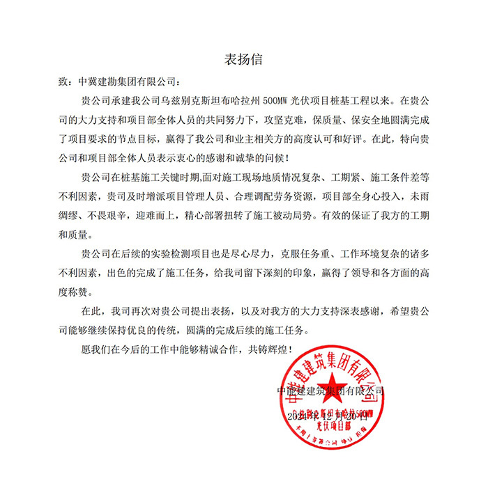 2024年12月20日,中能建建筑集團有限公司發來表揚信,對我公司施工的烏茲別克斯坦布哈拉州500MW光伏項目樁基工程及實驗檢測項目施工過程中,未雨綢繆,攻堅克難,合理調配人員和設備資源,克服了各種不利因素,保證了工程和質量,出色的完成了施工任務,贏得了領導和項目參建單位的高度稱贊,給予了表揚,并表示愿今后的工作中能夠繼續精誠合作。