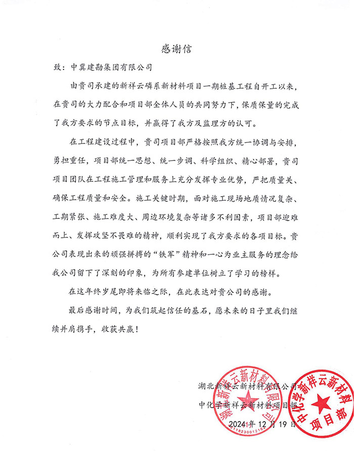 2024年12月19日,湖北新祥云新材料有限公司發來感謝信,對我公司正在施工的新祥云磷系新材料項目一期樁基工程在施工過程中,嚴格按照業主統一協調和安排,勇擔重擔,面對地質情況復雜、工期緊張、施工難度大等諸多不利因素,項目部迎難而上,發揮功堅克難的精神,順利完成了各項目標。對項目部表現出來的頑強拼搏的“鐵軍”精神和一心為業主服務的理念給予了表揚,特在年終歲尾之際發來感謝信。