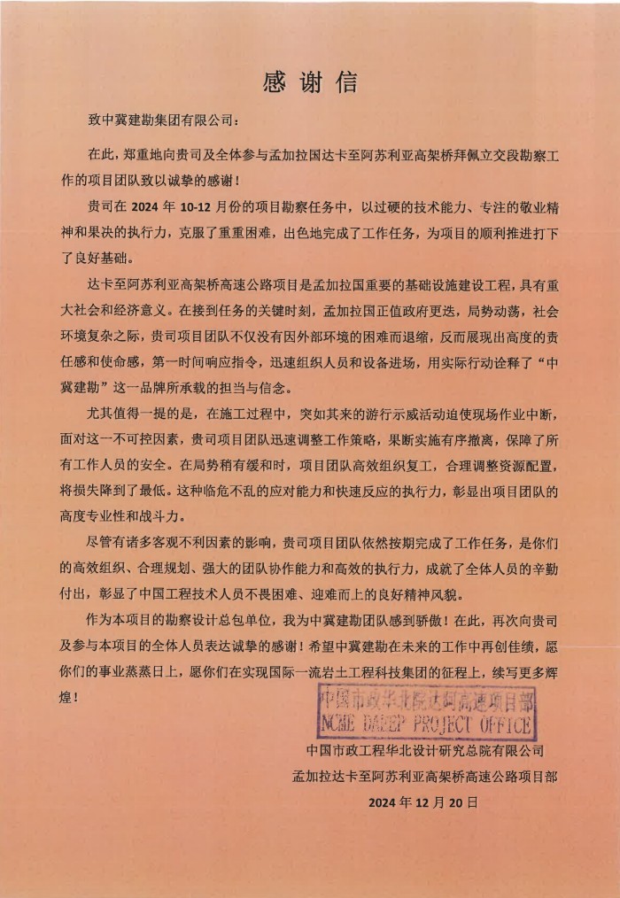 孟加拉達卡至阿蘇利亞高架橋高速公路項目部向我公司發(fā)來了感謝信,感謝我公司在項目勘察期間展現(xiàn)的高度專業(yè)精神和卓越執(zhí)行力。尤其在復(fù)雜的社會環(huán)境和突如其來的示威活動中,我公司項目團隊臨危不亂,迅速調(diào)整工作策略,保障了項目的順利推進和人員的安全。