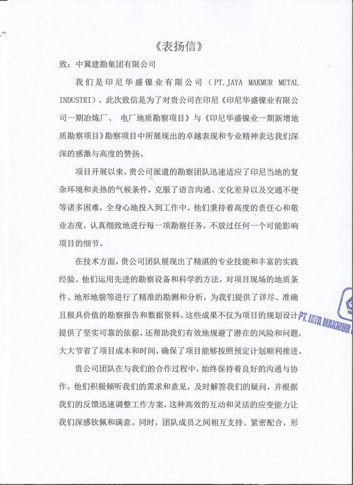 印尼華盛鎳業(yè)有限公司發(fā)來了表揚信。在印尼華盛鎳業(yè)有限公司一期冶煉廠、電廠地質(zhì)勘察項目及印尼華盛-年產(chǎn)200萬噸綜合鋼鐵項目的勘察任務(wù)中,印尼華盛勘察項目部全體職工迅速適應(yīng)印尼當(dāng)?shù)氐膹?fù)雜環(huán)境和炎熱的氣候條件,克服了語言溝通、文化差異以及交通不便等諸多困難,全身心地投入到工作中。在項目實施過程中,嚴(yán)格遵守印尼當(dāng)?shù)氐姆煞ㄒ?guī)和安全環(huán)保要求,采取了一系列有效的安全保障措施,確保了勘察工作的安全有序進行。這種高度的專業(yè)素養(yǎng)和社會責(zé)任感,贏得了業(yè)主方的高度贊揚和深深感激。