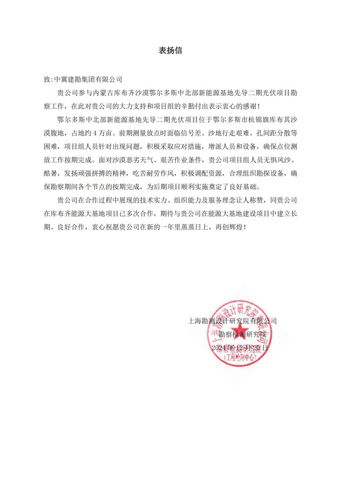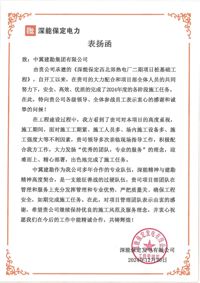 此外,我公司參與的新疆農(nóng)六師鋁業(yè)CFG樁項目、內(nèi)蒙古庫布齊沙漠鄂爾多斯中北部新能源基地光伏項目、深能保定西北郊熱電廠樁基礎(chǔ)工程等多個國內(nèi)外項目收到業(yè)主單位表揚信,對我公司在項目中的高效執(zhí)行、嚴(yán)謹(jǐn)管理和出色的團隊協(xié)作表示衷心感謝,并希望未來繼續(xù)與我公司保持緊密合作。