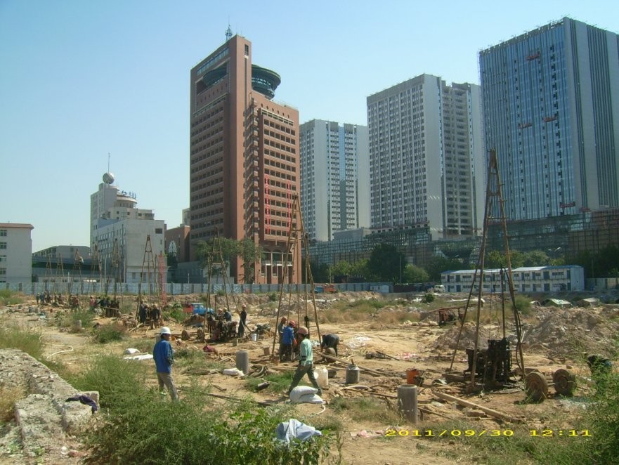擬建場地基巖面起伏較大,巖溶地質條件復雜,基巖內溶洞、裂隙發育。溶洞最大高度為9.7m,對勘察揭露的空洞、半充填溶洞及破碎帶采用先充填粗骨料后注漿治理方法;對嵌巖樁采用“一樁一探、探治結合”;根據巖溶治理方案專家論證評審意見,對對原古采煤巷道采用鉆探與物探相結合的方法。利用鉆探孔直接在巷道平面位置及周邊進行巷道探查,利用井下電視、井間CT、淺層地震和瞬變電磁物探手段進行驗證,同時對遠年采空區進行了探查驗證并進行了治理。2012年4月22日,專家評審驗收意見為:提供的巖溶地基治理竣工資料齊全、內容較全面,滿足巖溶地基治理工程竣工驗收評審要求;檢測單位采用了鉆探及面波等檢測方法可靠;巖溶地基治理效果達到了設計要求,同意通過竣工驗收評審。